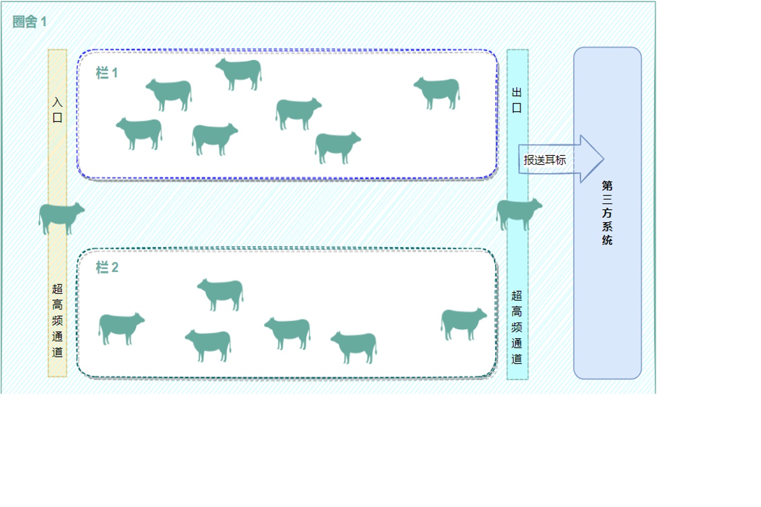 超高頻UHF耳標應用在圈舍入口及出口設立專用識別通道,需要管理的動物初戴耳標后經由通道時系統自動識別并注冊信息,在圈舍間轉移時也將由自動自動計數管理,并且這些信息也可報送第三方系統,(如:動物監管及金融保險)