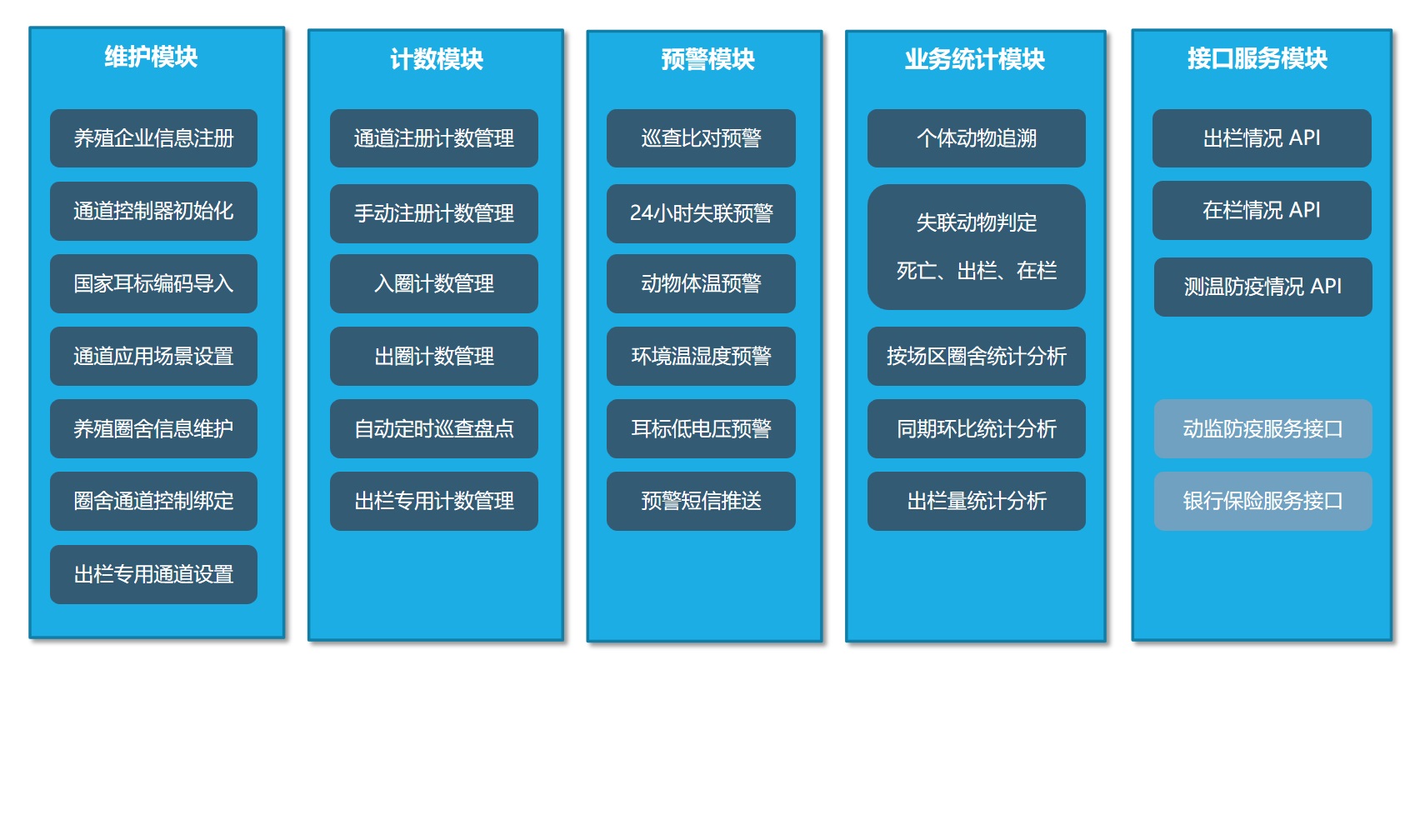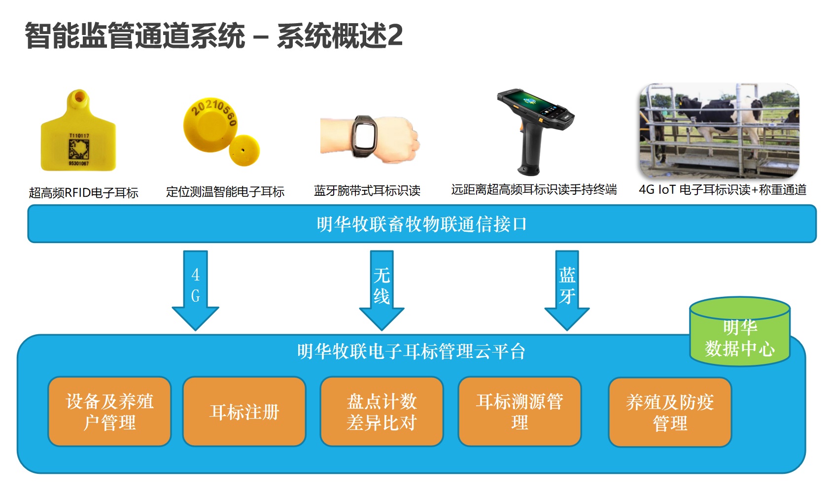 隨著科技的發展,傳統畜牧業迎來了牧聯網科技的新時代。深圳明華智能通道系統運用超高頻RFID技術、4G北斗定位技術、溫濕度感應技術及Iot物聯技術等現代流行技術為畜牧業養殖提供了高效的管理方式,從養殖牲畜個體身份的智能識別到實時測溫預警、體尺體重監測以及存欄牲畜的自動巡查盤點、迅速完成入欄、回欄及出欄計數及各種養殖業務數據信息的精準統計等,能夠為畜牧業養殖的現代化、智能化發展帶來新的幫助;而應用智能監管通道形成的電子監管圍欄,可減少人工作業量,同時系統也可與防疫監管部門及第三方銀行保險金融單位的各類監管及風控系統進行API數據對接,提供有效準確的數據參考價值。