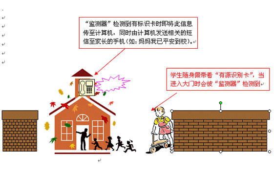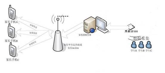 1. 系統(tǒng)原理:本系統(tǒng)的基本運(yùn)用原理大致為每個(gè)學(xué)生只要帶有一枚RFID即無(wú)線感應(yīng)標(biāo)識(shí)卡,在到達(dá)學(xué)校大門后,校門附近的感應(yīng)器就會(huì)讀到標(biāo)識(shí)并將信息傳給計(jì)算機(jī),由計(jì)算機(jī)分別向相關(guān)的學(xué)生父母手機(jī)發(fā)送一條短信,如“爸爸,我已平安到校了”“爸爸,我放學(xué)了,一會(huì)就回家”,同時(shí)在計(jì)算機(jī)中也會(huì)保存所有學(xué)生的進(jìn)出信息,并將它整理成報(bào)表供學(xué)校、家長(zhǎng)查詢。利用該短信平臺(tái)班主任可將每個(gè)學(xué)生的在校學(xué)習(xí)和生活情況等定時(shí)或不定時(shí)的集中或單獨(dú)發(fā)送至家長(zhǎng)的手機(jī),免去老師逐一通知或家長(zhǎng)缺席家長(zhǎng)會(huì)等情況而產(chǎn)生的各種交流屏障,方便快捷。該類似系統(tǒng)在美國(guó)、歐洲等發(fā)達(dá)國(guó)家已得到廣泛應(yīng)用,已成為老師和家長(zhǎng)溝通的橋梁, 廣受歡迎。